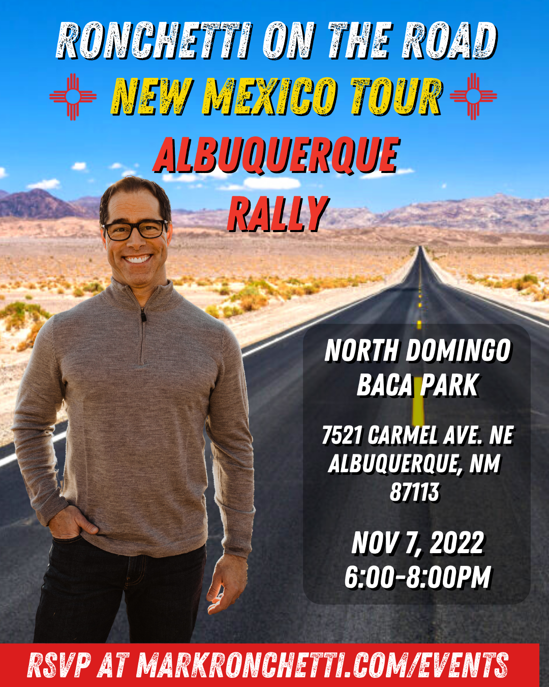 Ronchetti is Still on the Road Monday, November 7, 2022 6:00 PM 7:00 PM Horseshoe Saloon 7521 Carmel Avenue Northeast Albuquerque, NM, 87113 United States (map) Google Calendar ICS Ronchetti is Still on the Road - New Mexico TourCome on out and support Mark Ronchetti as he travels to each county in New Mexico. He will be in Albuquerque on Monday, Nov. 7, from 6:00 pm to 8:00 pm at North Domingo Baca Park (7521 Carmel Ave. NE) in Albuquerque.